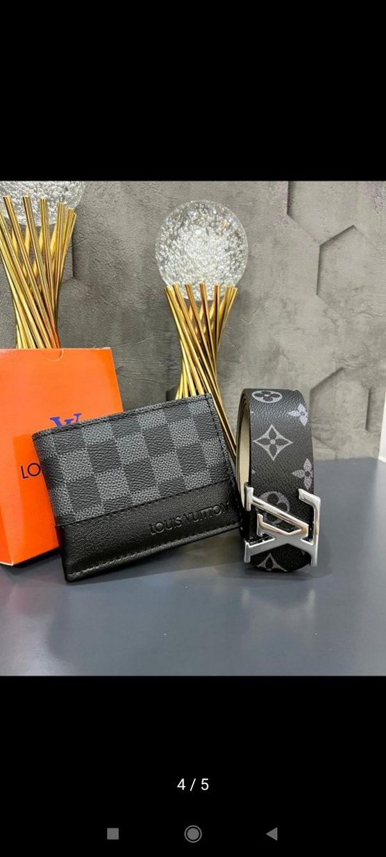 Louis Vuitton marka, siyah gri kareli desenli erkek cüzdan ve baskılı kemer seti. Trendy casual sokak stili için uygun.