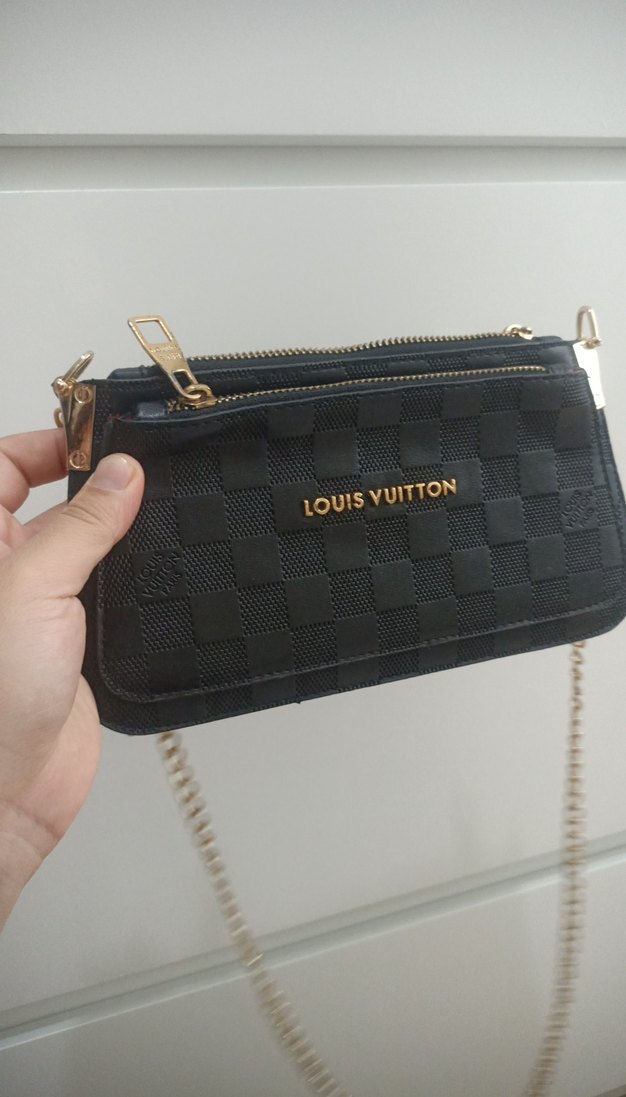Louis Vuitton markalı, siyah kareli deri tasarımlı, fermuarlı modern klasik stil clutch çanta. a kalite cuzdan modeli portföy çanta bir kere taktim