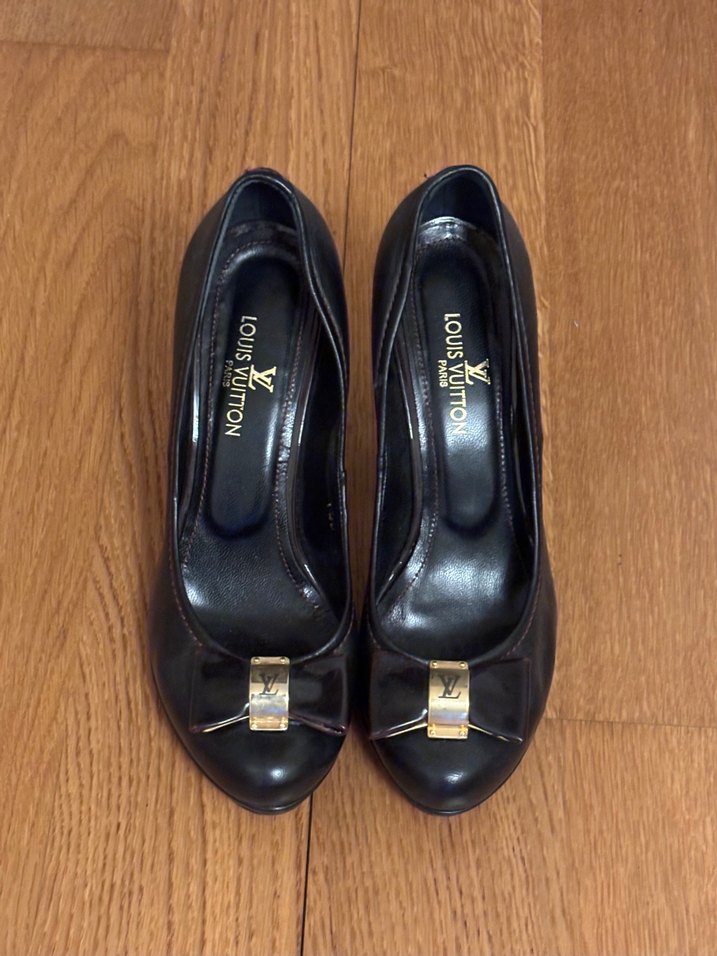 Siyah Louis Vuitton kadın stiletto, blok topuklu ve altın tokalı detaylı. 38 numara Materyal: %100 deri Topuk Boyu: 10 cm