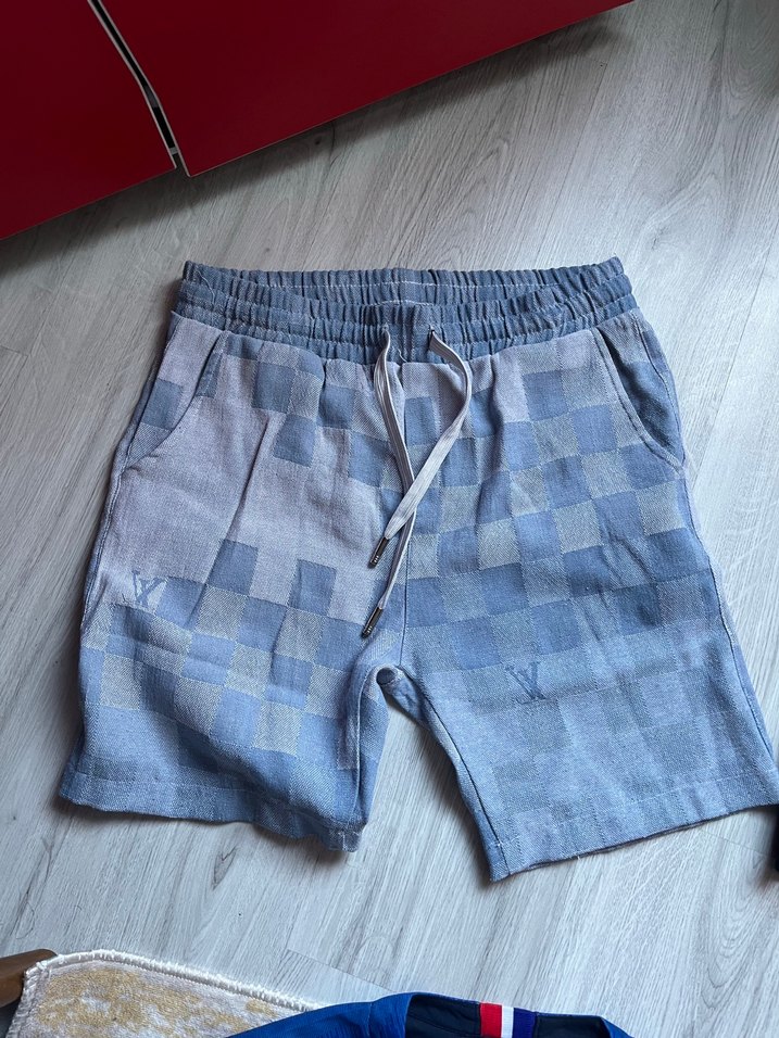 Mavi-gri kare desenli, bol kesim erkek denim mini şort. Rahat elastik bel ve bağcık detayıyla günlük sokak stiline uygun, zahmetsiz şıklık sunar.