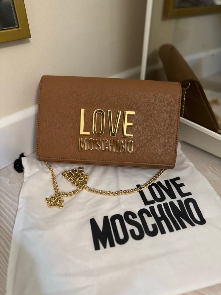 Love Moschino kahverengi deri çanta, zincir detayı ve parlak yüzeyiyle dikkat çekiyor. Baskılı deseniyle sokak modasına uygun, günlük kullanıma ideal. Orjinaldir . Yalnızca 2 kez kullanıldı