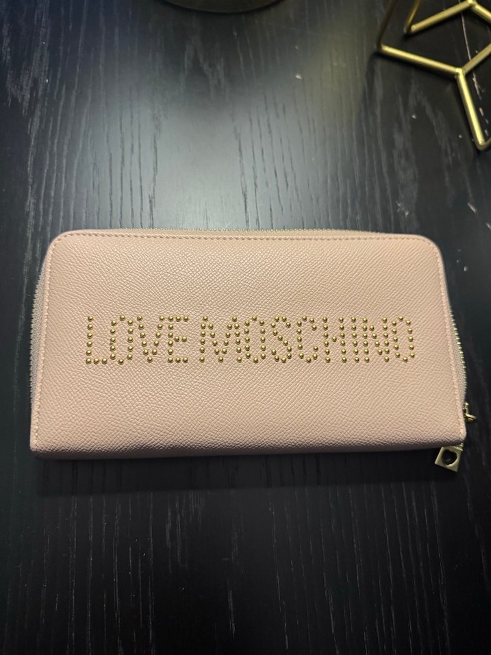 Love Moschino markalı pudra deri cüzdan, fermuarlı kapama ve çivili logo baskısıyla sokak modasına uygun.