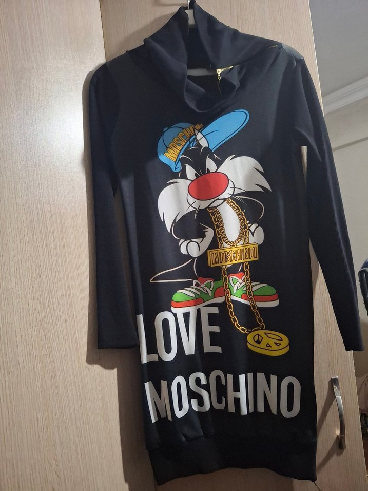 Siyah uzun kollu, bol kesim, baskılı karikatür figürlü ve triko detaylı sweatshirt. "LOVE MOSCHINO" yazısı bulunur.