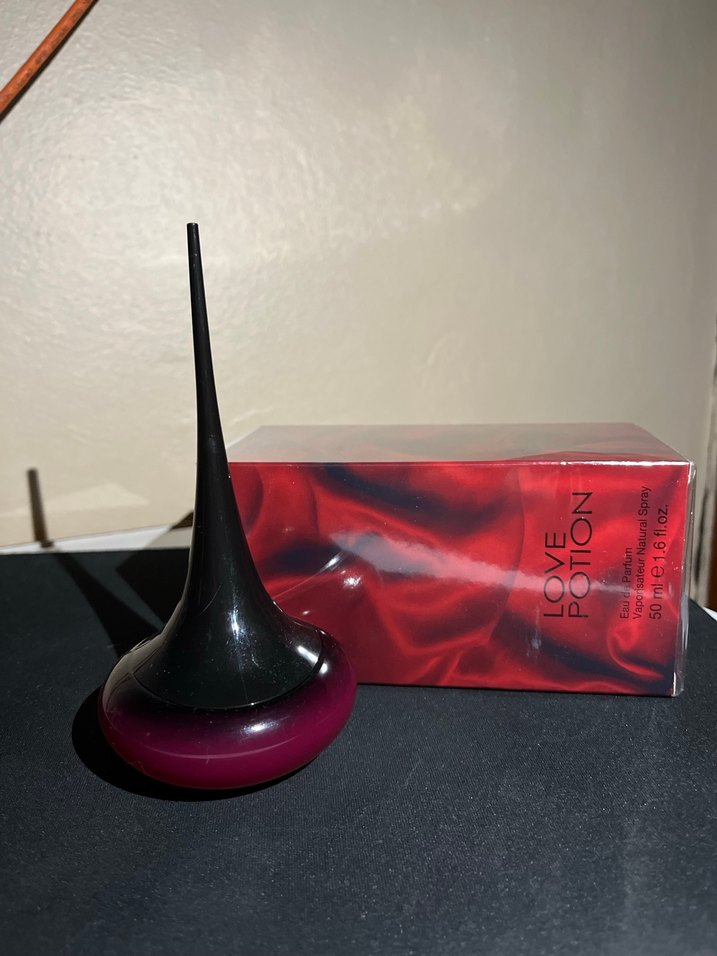 Love Potion kadın parfümü, 50 ml şişede, uzun siyah kapak ve koyu kırmızı taban tasarımına sahiptir. Büyüleyici bir koku sunar.