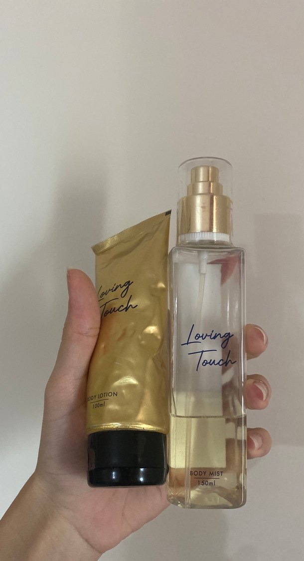 Loving Touch kadın vücut losyonu (100ml) ve vücut spreyi (150ml) seti. Losyon altın renk tüpte, sprey ise şeffaf şişede bulunur.