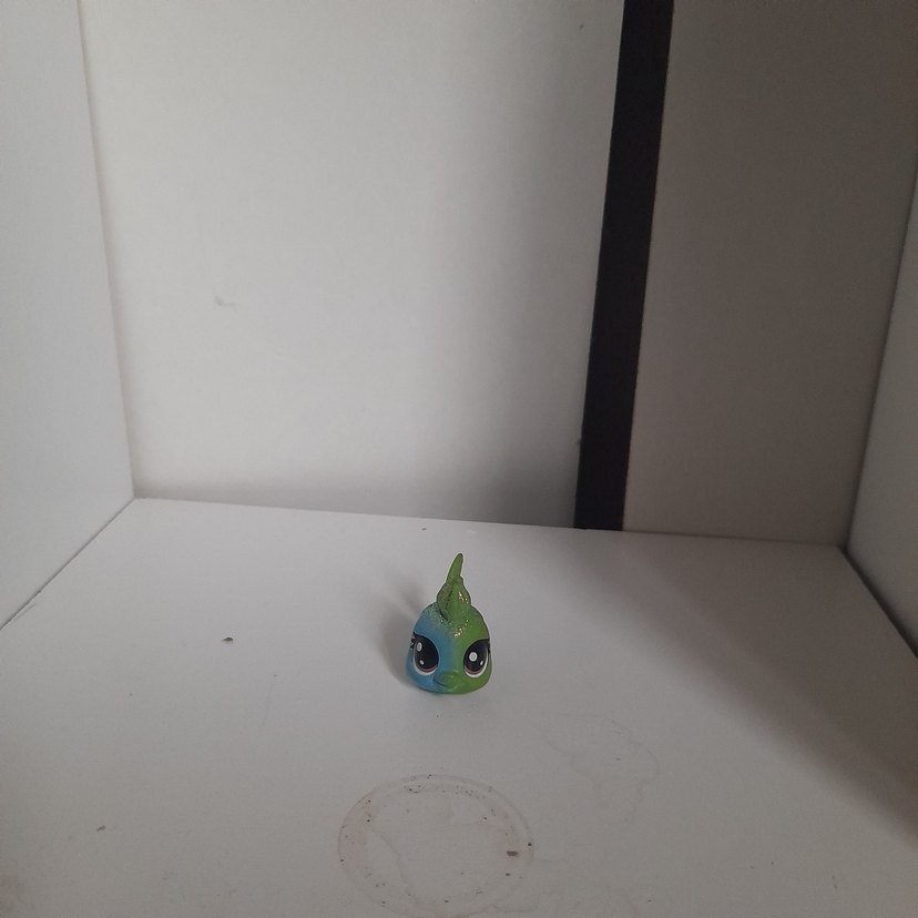 Büyük ifadeli gözlere sahip, benzersiz sivri baş tasarımlı küçük parlak yeşil aksiyon figürü.