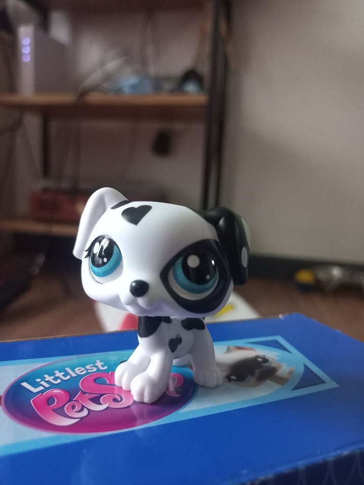 Büyük mavi gözlü, beyaz ve siyah küçük köpek figürü, mavi Littlest Pet Shop kutusu üzerinde duruyor.