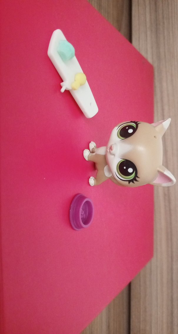 Büyük gözlü, pastel pembe küçük bir aksiyon figürü, beyaz besleme aparatı ve mor kase ile birlikte.