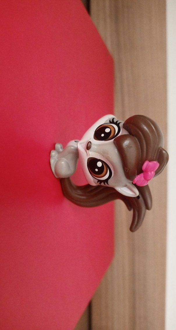 Büyük ifadeli gözlere ve pembe fiyonkla bağlı pastel kahverengi saça sahip oyuncak figür.