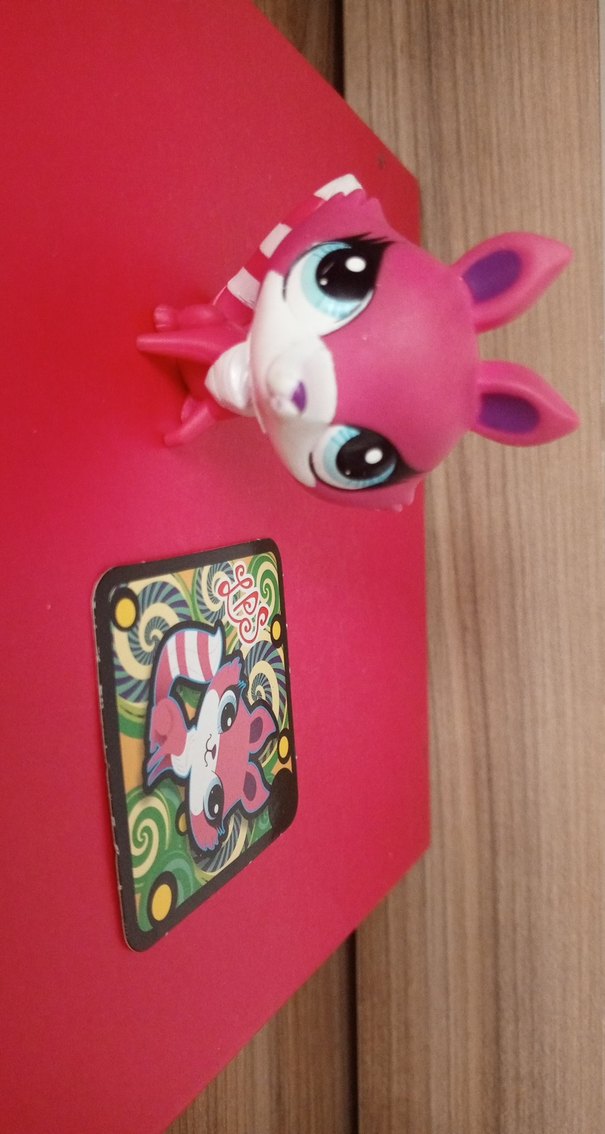 Büyük gözlere sahip renkli pembe aksiyon figürü, yanında uyumlu illüstrasyonlu kart ile birlikte gelir.