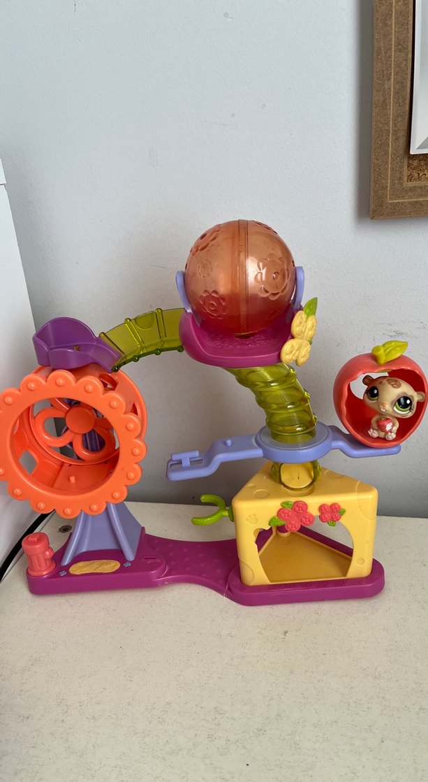 Renkli tüneller, dönen tekerlek ve elma şeklinde bir bölmede küçük hayvan figürü bulunan oyuncak seti. Canlı ve eğlenceli tasarım.