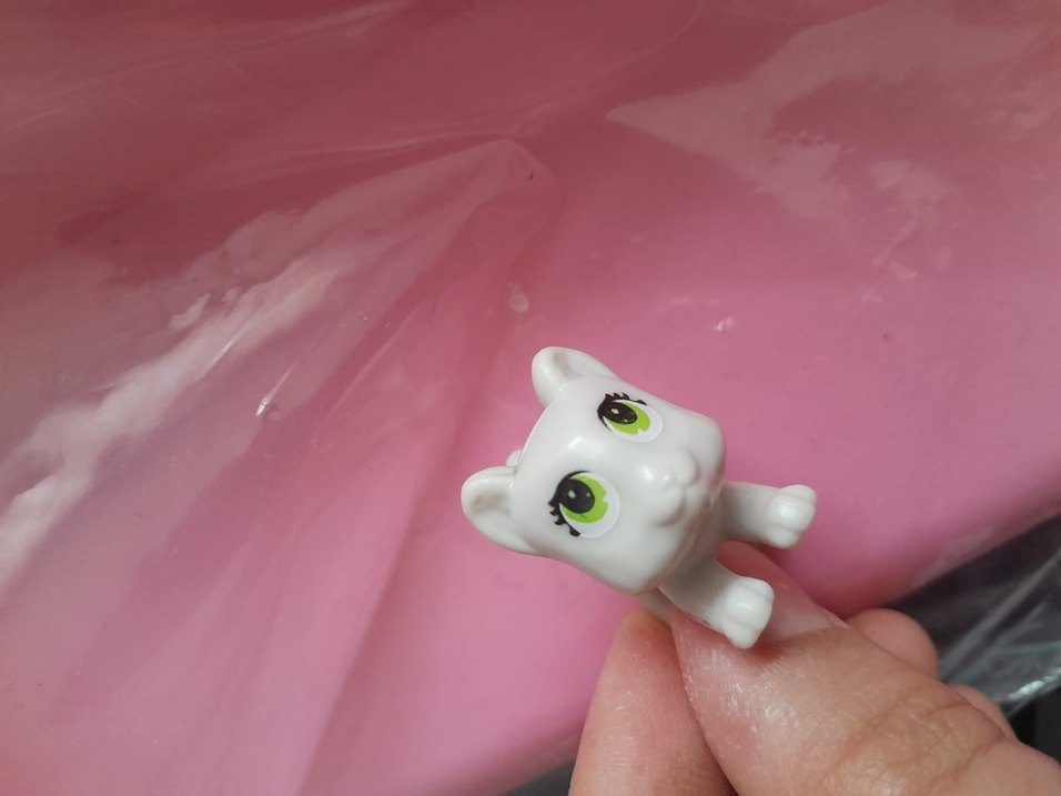 Büyük yeşil gözlere sahip küçük beyaz aksiyon figürü, renkli ve sevimli bir karakteri yansıtıyor.