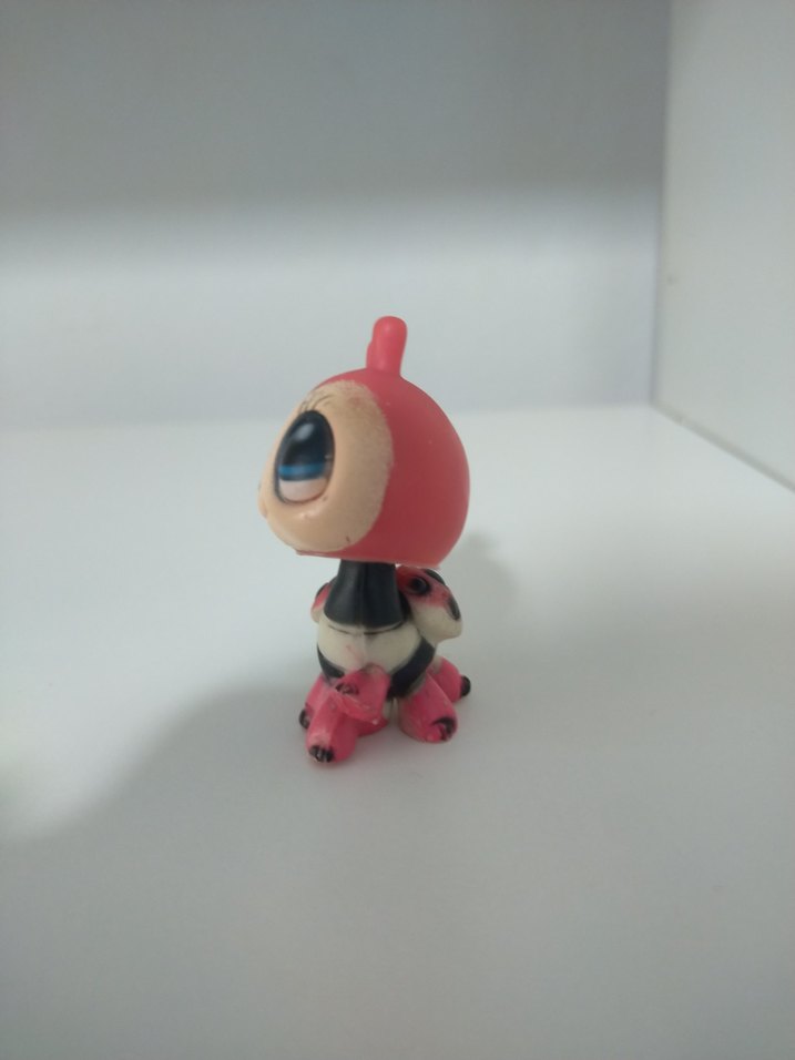 Büyük gözü ve pembe, siyah-beyaz detaylı renkli aksiyon figürü. Oturur pozisyonda oyuncu tasarıma sahip.