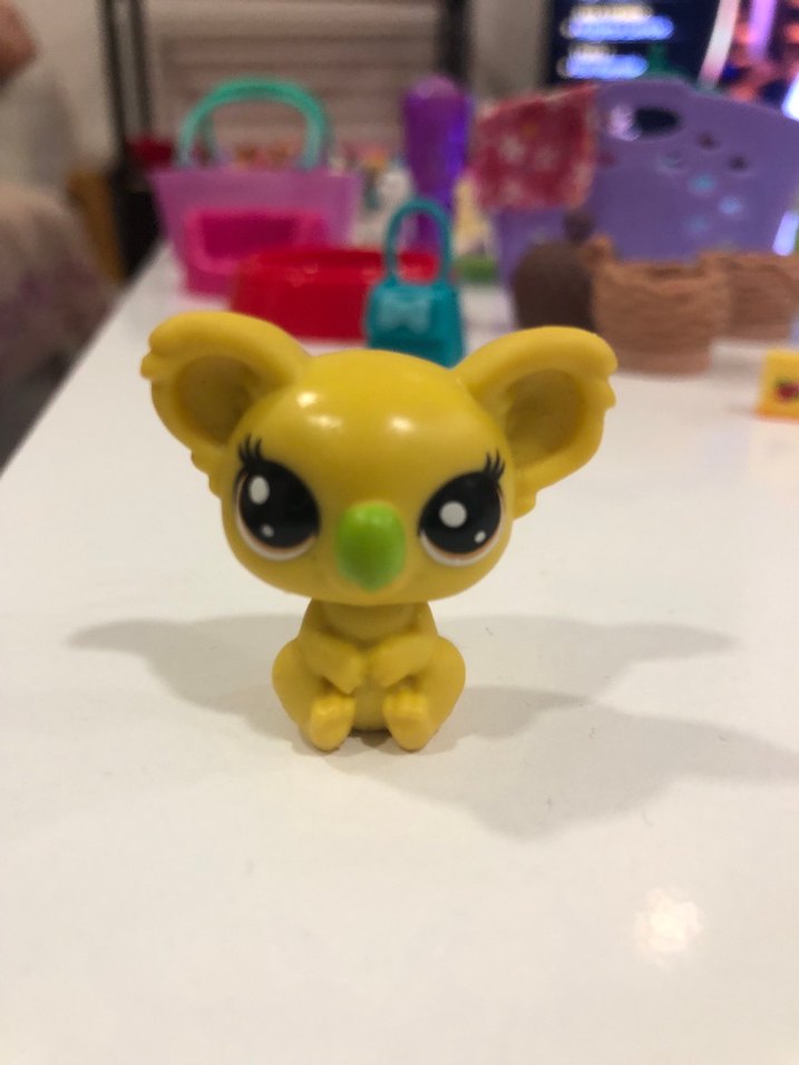 Büyük gözlü ve yeşil burunlu, renkli sarı lps koala minniş figürü, koleksiyonluk oyuncak olarak tasarlanmıştır.