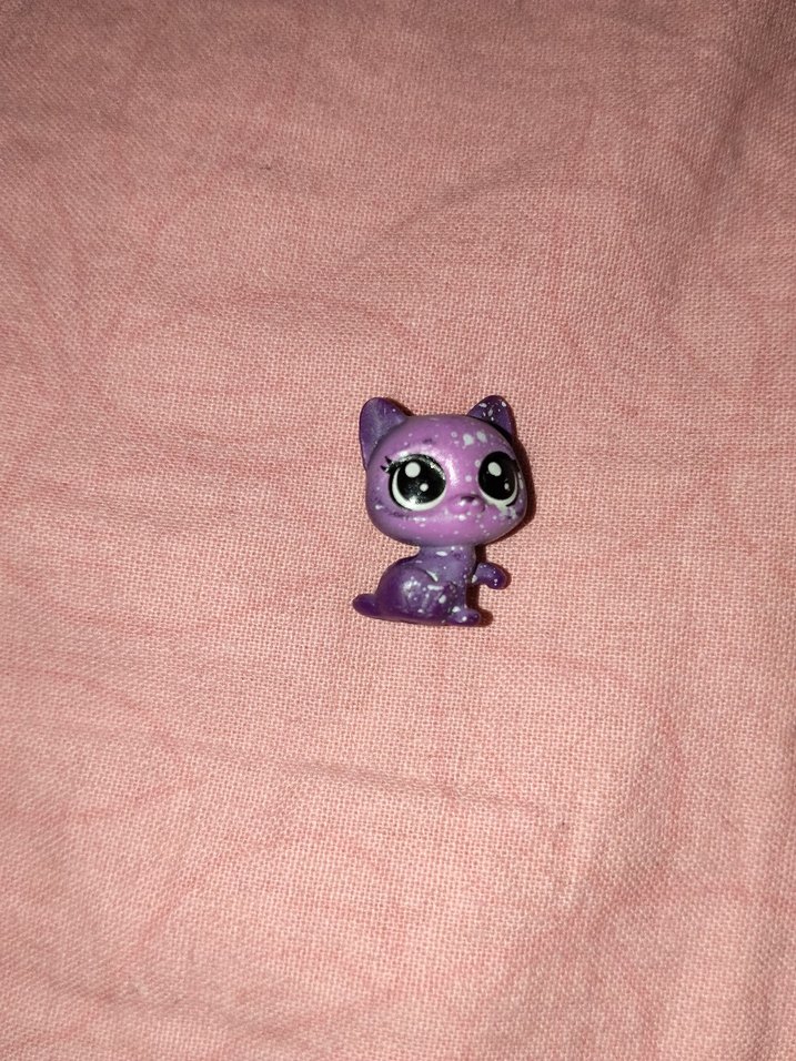 Pastel mor renkte, büyük gözlü ve oturur pozisyonda küçük kedi figür oyuncak. Sevimli tasarımlı koleksiyon ürünü.