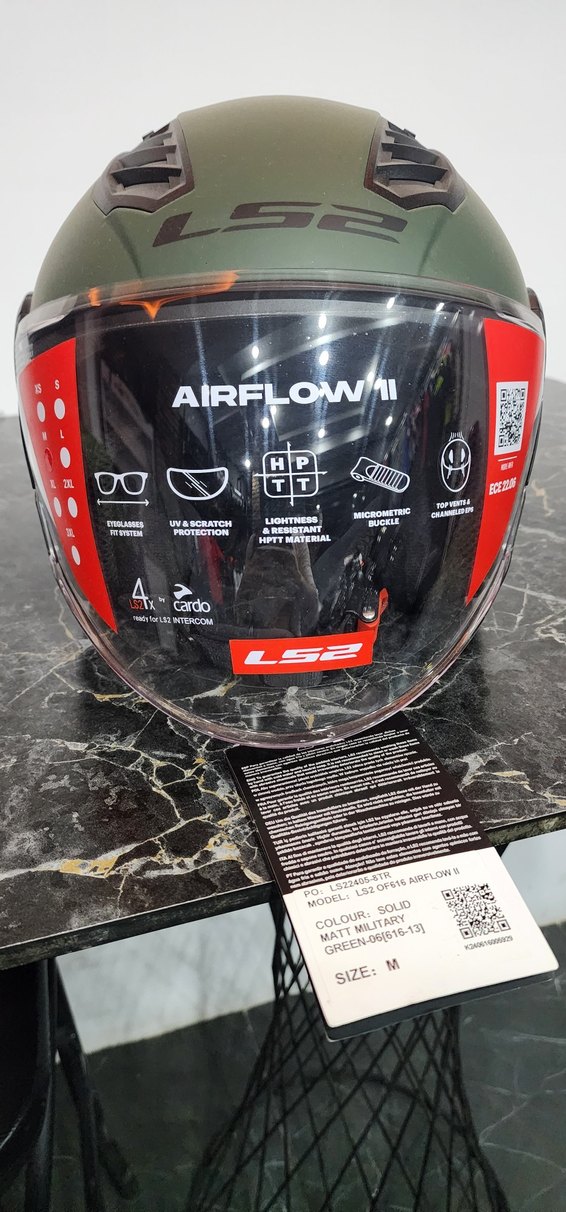 Mat haki renkte, plastik malzemeden yapılmış LS2 Airflow motosiklet kaskı. UV ve çizilmelere karşı koruma, hava akışı sistemi ve mikrometrik toka ile donatılmıştır. Velcro bantlı, beden M.