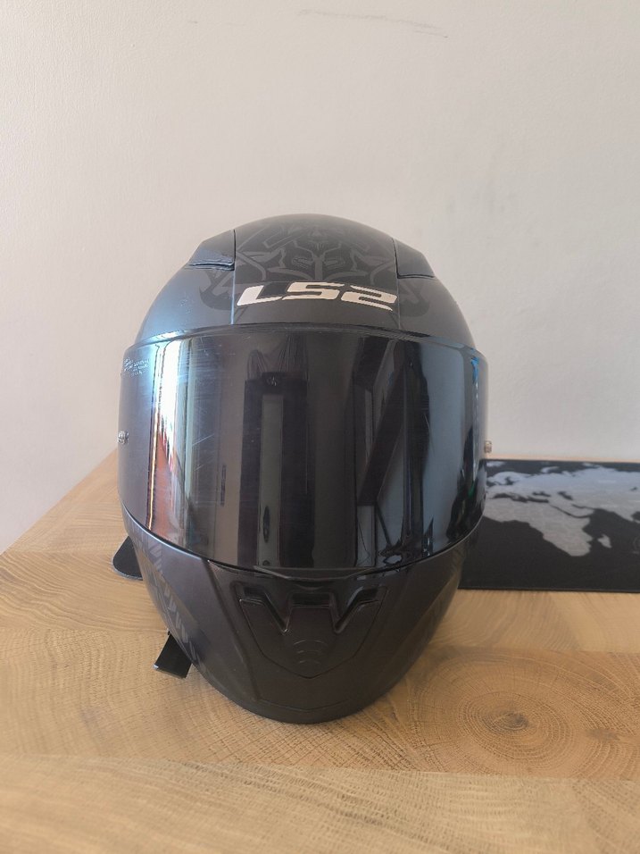 Baskılı tasarıma sahip gri LS2 motosiklet kaskı, koyu renk vizör ve yanında şeffaf vizoru bulunmaktadir