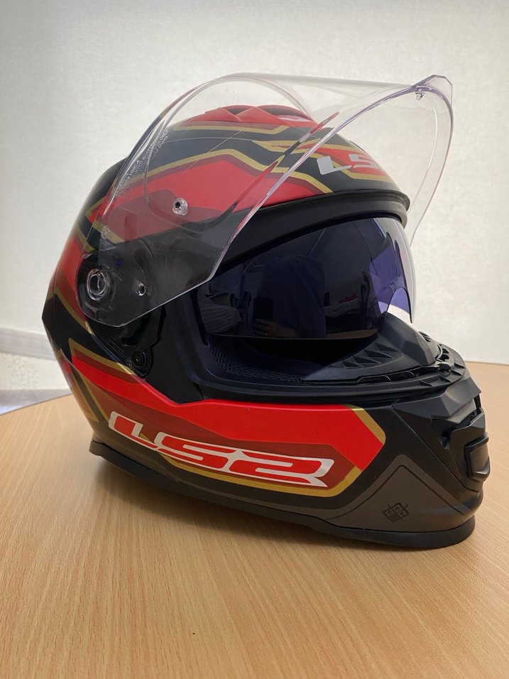 Koyu kırmızı baskılı LS2 kask, tokalı kapama ve şeffaf vizöre sahiptir. LS2 Storm marka M beden güneş gözlüğü var pedleri iyi durumda vizörün oturduğu yer çatladı geri yapıştırıp tamir edildi kullanıma engel hiçbir sıkıntısı yok
