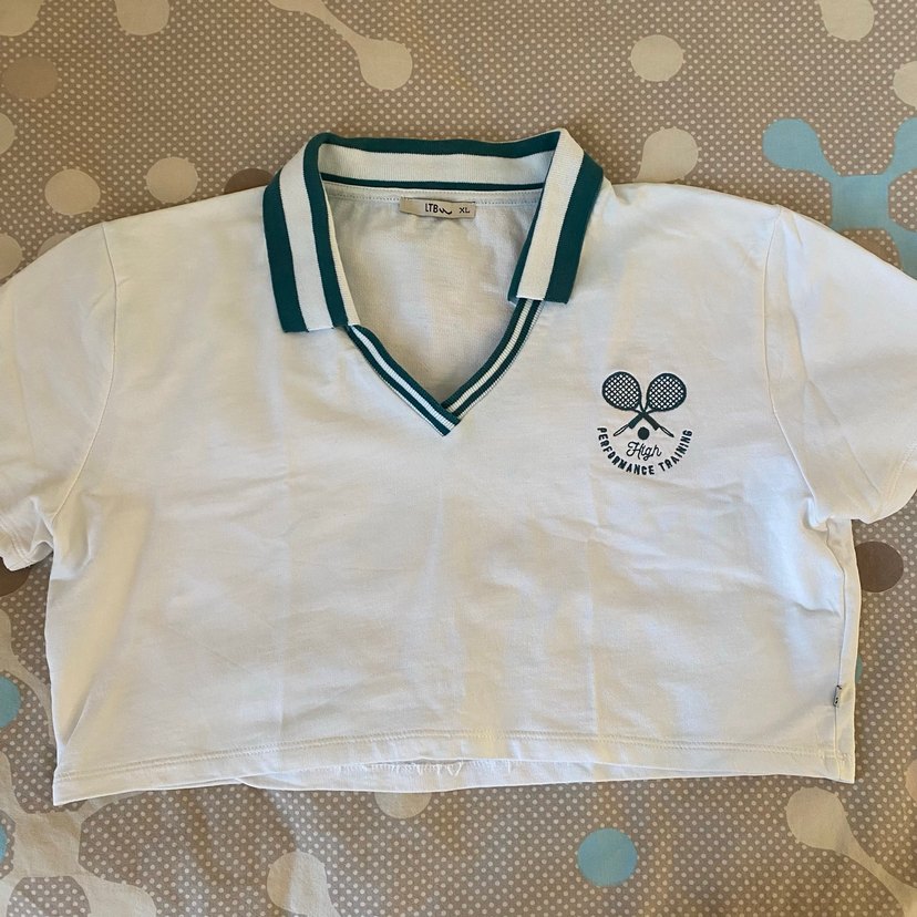 Pamuk kumaştan yapılmış, yeşil çizgili yakalı ve düğmeli, baskılı tenis desenli beyaz Aldığımdan beri hiç giymedim. M bedene sahiptim XL beden gayet iyi oldu
