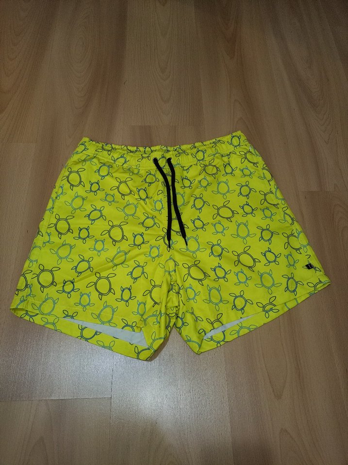 Renkli kaplumbağa desenli, bağcıklı, bol kesim sarı erkek deniz şortu, plaj ve sokak tarzına uygun. Denemeden aldım, bana olmuyor. Sıfır üründür, herhangi bir kusuru yoktur, etiketi yoktur. M beden etiketli olup S bedene uygundur.