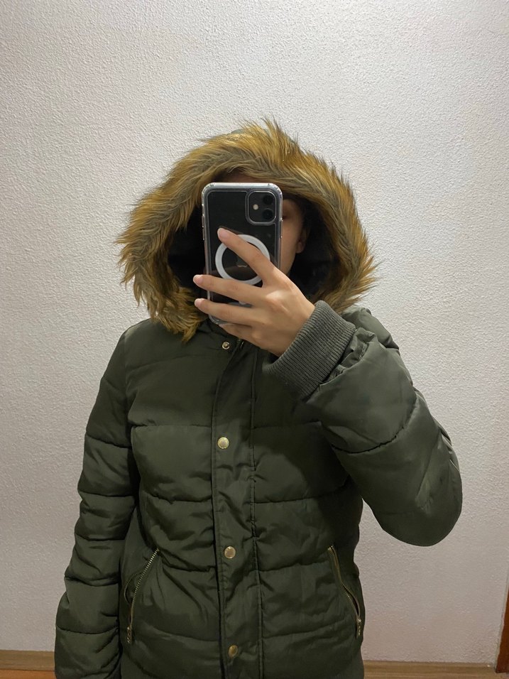 haki renkli, kürklü kapüşonlu, uzun kollu ve normal midi boyda, rahat ve kalın kumaştan yapılmış,hiçbir deformesi olmayan, tam oturan kadın kış montu. ❄️