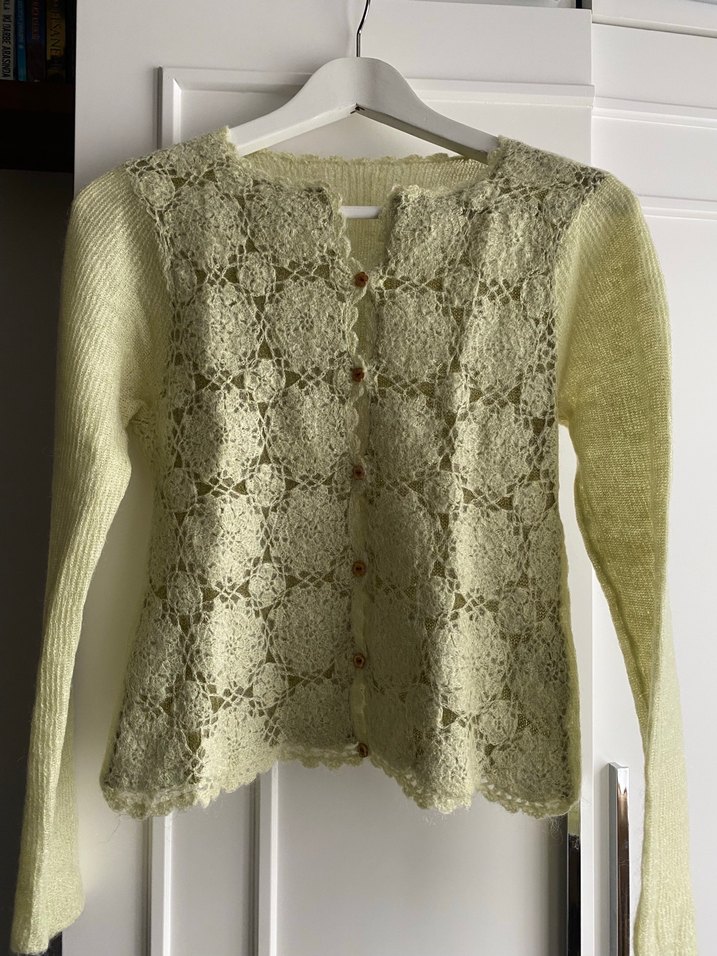Fıstık yeşiline benzer bir rengi var, yuvarlak yaka ve uzun kollu bohem tarzda, midi uzunlukta kadın hırka.