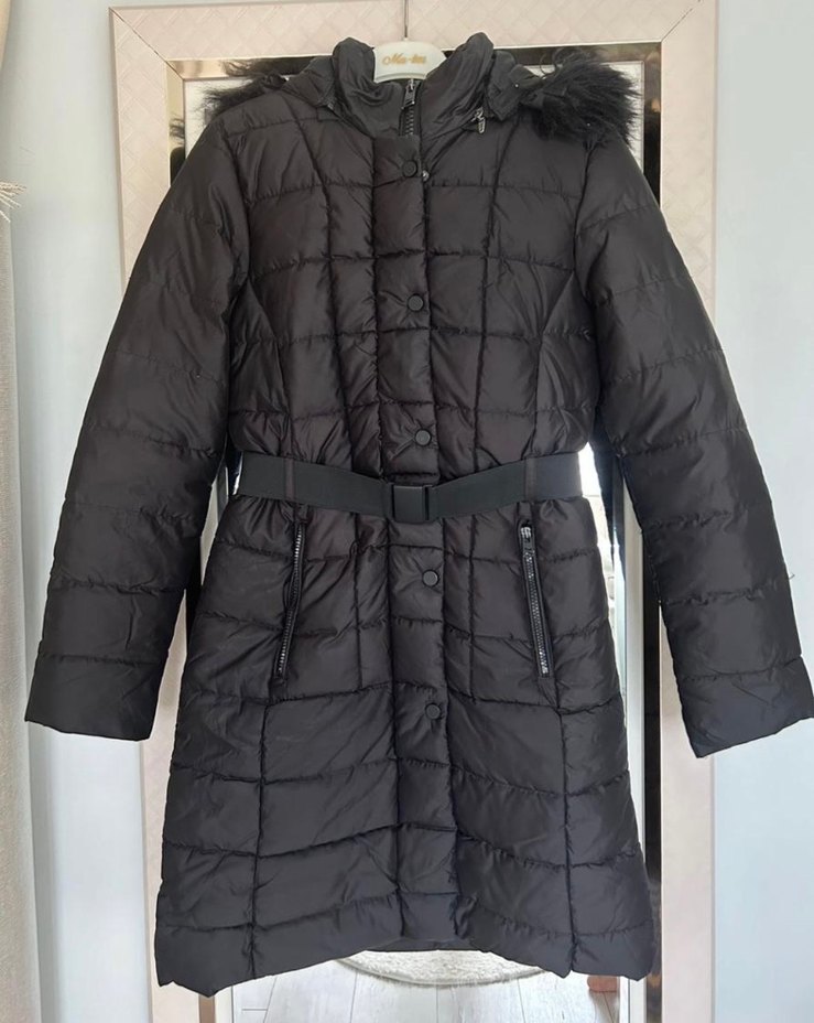 Kemerli, siyah, midi boy, fitted kışlık mont. Notch yaka ve bantlı kollarla rahat, sokak modasına uygun tasarım. Günlük kullanıma uygun. Kusuru yoktur