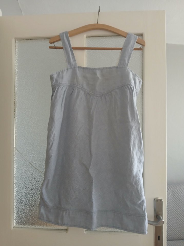Giyilmiş ürün yırtıgı söküğü yok keten kumaştan, askılı ve kolsuz, midi boyda, bol kesim Minimalist ve desensiz, günlük kullanıma uygun rahat ve şık duruyor #LTB#keten#elbise #renk açık çıktı ışıktan açık mavi çizgili renk