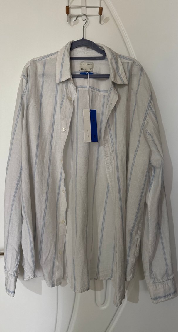 Yumuşak keten kumaştan, düğmeli ve gri çizgili beyaz renkli, uzun kollu, normal uzunlukta, salaş kesim erkek gömlek. Ofis ve günlük kullanım için uygundur. ! xl etiketli, hiç kullanılmamıştır. Tekliflere açığım.
