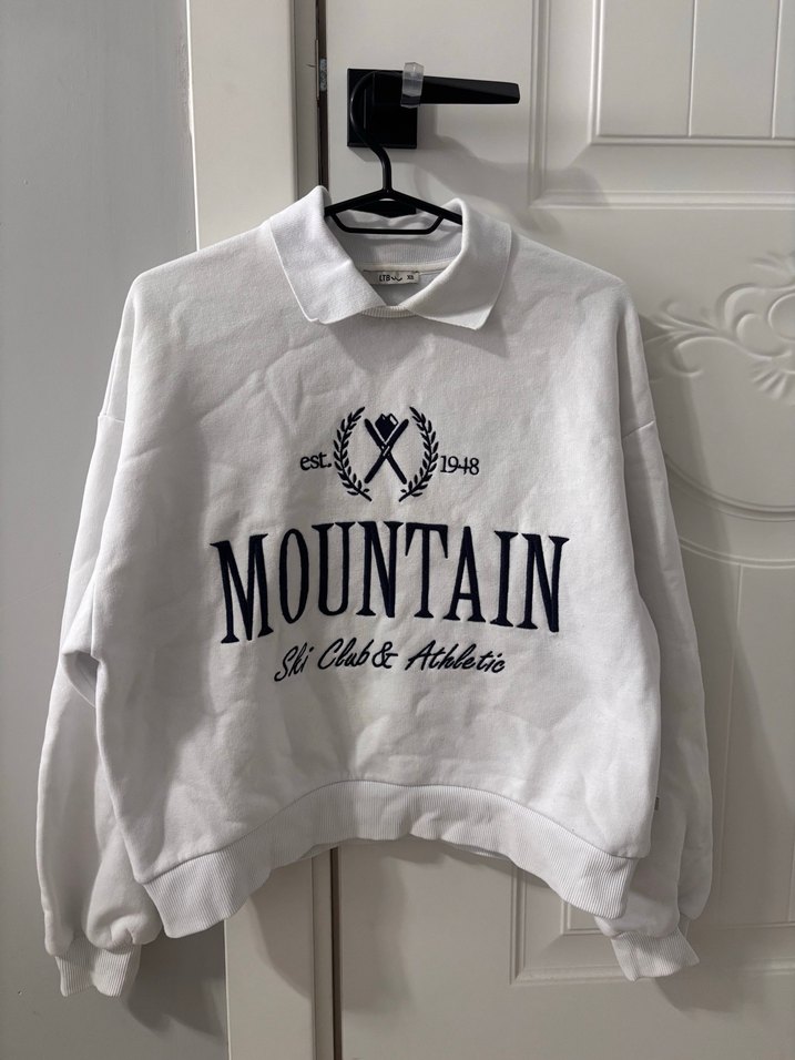 Beyaz, uzun kollu, yuvarlak yakalı ve normal kesim kadın sweatshirt. "MOUNTAIN Ski Club & Athletic" baskılı, yumuşak ve sıcak kumaştan, dış mekan kullanımı için uygundur. ️