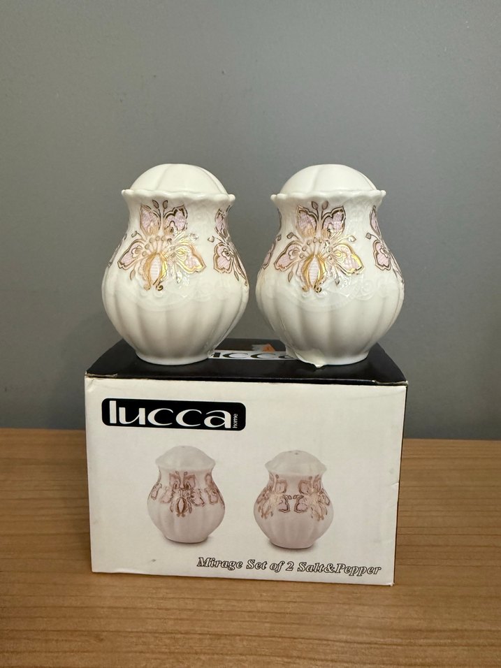 Lucca marka beyaz tuzluk ve biberlik seti, zarif çiçek desenleriyle mutfakta kullanıma uygun. 0 hiç kullanılmadı kutusuyla beraber gönderilecektir. çok küçük ince beyaz çizgiler var boya kısımlarında ama sadece son fotoğrafta görüldüğü kadar.