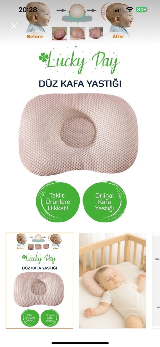 Lucky Day düz kafa yastığı, bebeklerde düz kafa oluşumunu önlemeye yardımcı olur. Yumuşak, nefes alabilen kumaş ve ergonomik tasarıma sahiptir. Aynısı sıfırı şuan 693₺. İkizlerime almıştım kuvözde çok kaldıkları için kafalarının arkaları biraz düzdü. Düzenli kullanımda gerçekten etkisi oluyor.