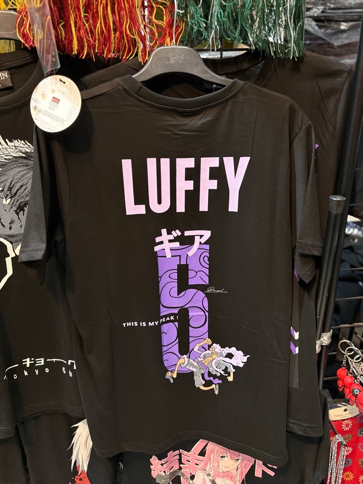 Bedenler mevcut Luffy baskılı, kısa kollu, mor renkte pamuklu erkek tişört. Bol kesim, bisiklet yaka ve dantel detaylarla sokak modası stilinde, günlük kullanıma uygun.