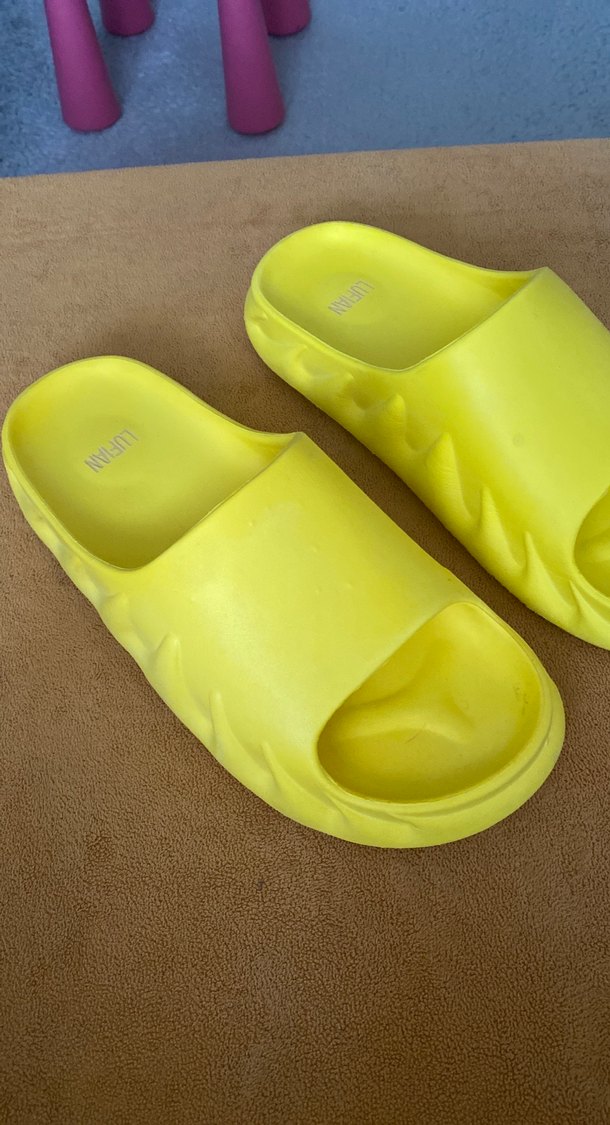 Sarı parlak platform terlik, kauçuk malzemeden üretilmiş, minimalist ve desensiz tasarıma sahip. Plaj için uygun, zahmetsiz şıklık sunar.