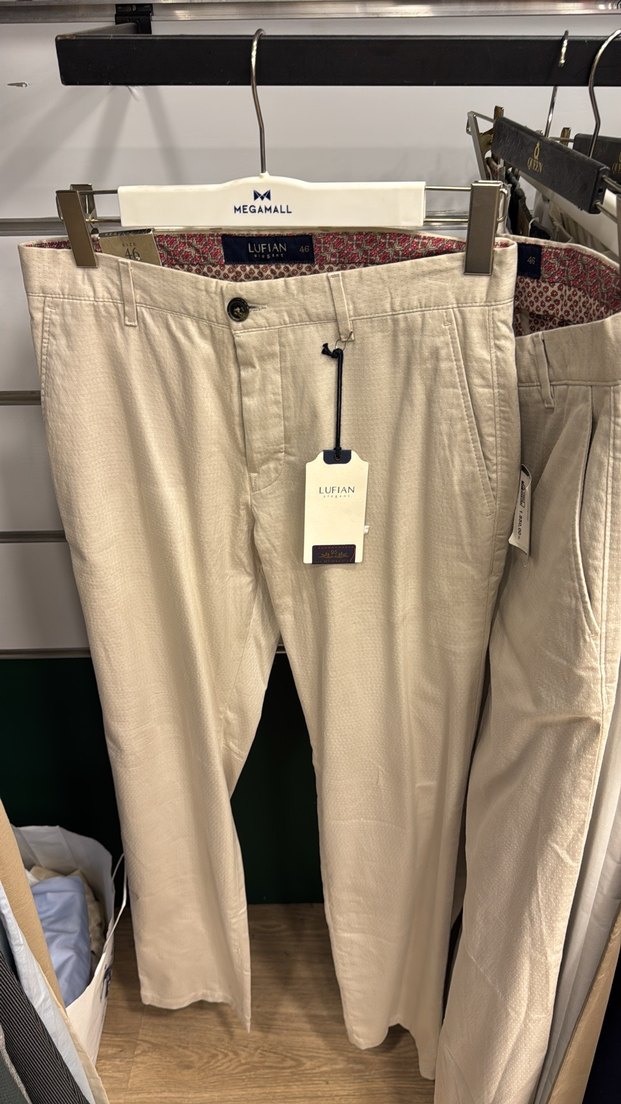 Lufian markalı, kemerli ve regular fit bej pamuklu erkek pantolonu. Midi boy, desen içermeyen dokusu günlük sokak stiline uygundur. İç kısmı gri tonludur.