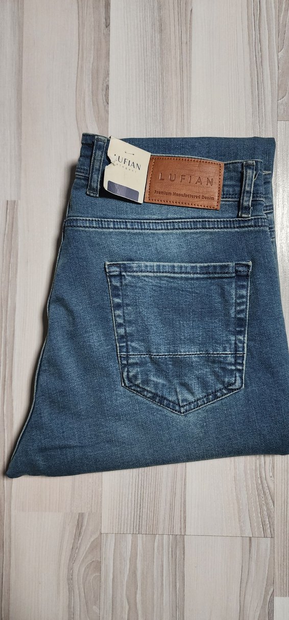 LUFIAN markalı, regular fit erkek kot pantolon. Parlak kahverengi düğme detaylı, günlük sokak stili için uygun, normal boyda.