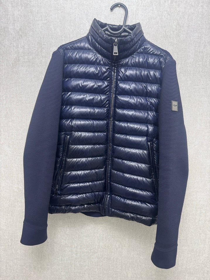 Erkekler için fermuarlı, yüksek yakalı, spor tarzda, fitted kesim lacivert mont. Önde dolgulu, kollarda dokulu sentetik kumaş, günlük kullanıma uygun.