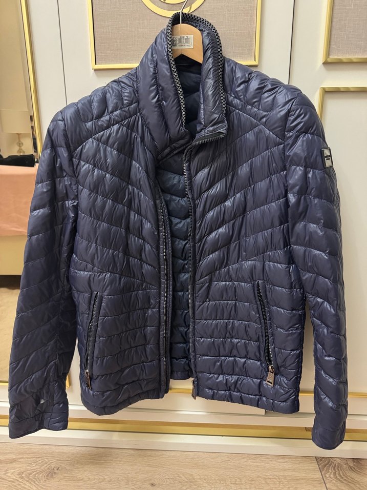 Erkekler için koyu mavi kapitone ceket, çıtçıtlı yaka ve fermuarlı ceplere sahiptir. Rahat kesim, uzun kollu ve sokak tarzına uygun, günlük kullanıma elverişlidir. Sentetik kumaştan yapılmıştır. Lufian