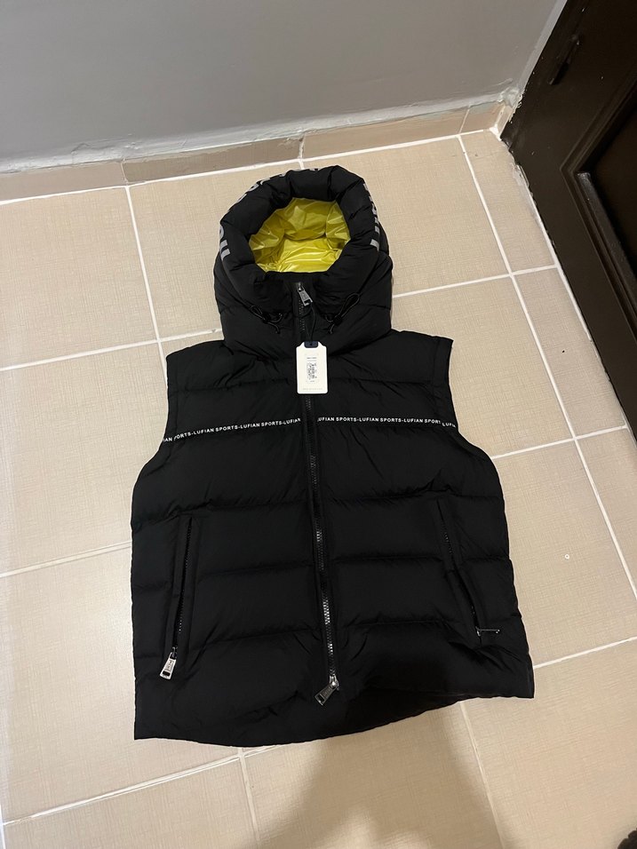 Yumuşak tüylü kumaştan yapılmış, fermuarlı ve yüksek yakalı siyah kolsuz şişme yelek. Günlük sokak stili için uygun, vücuda oturan kesim.