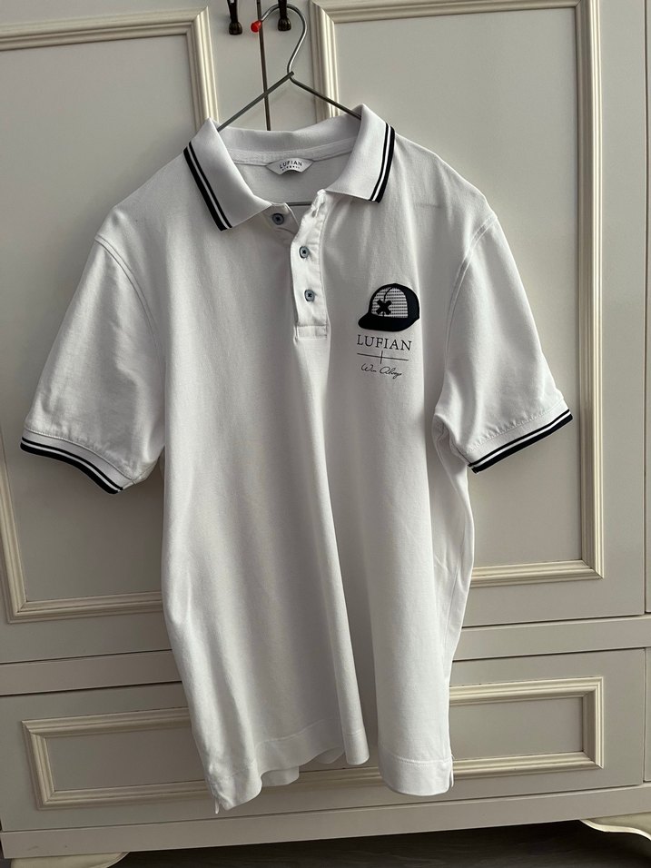 Pamuklu kumaştan yapılmış, düğmeli yakalı ve kısa kollu, gri baskılı LUFIAN logosuna sahip dar kesim erkek polo tişörtü.