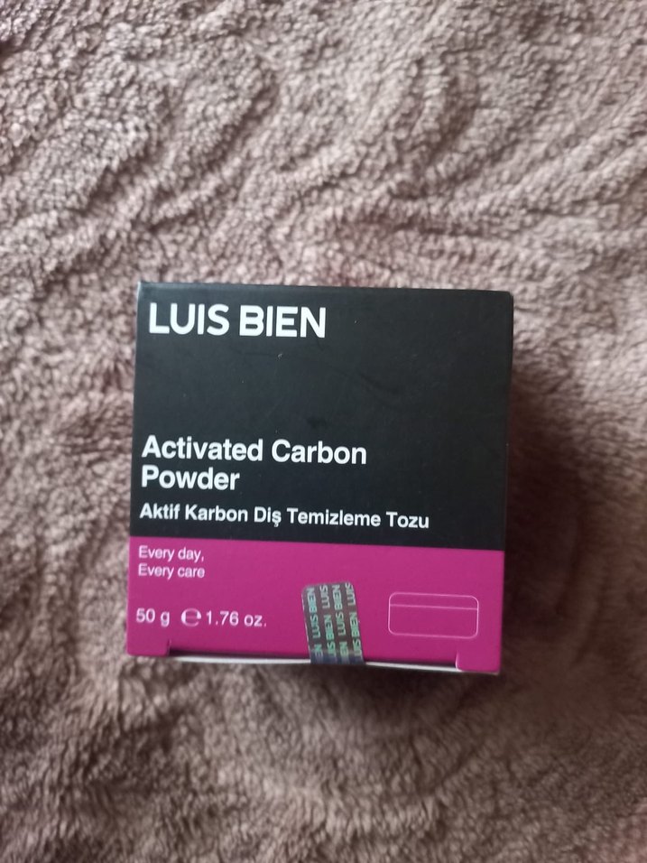 Luis Bien aktif karbon diş temizleme tozu, 50g. Günlük ağız bakımı için uygundur. Bordo ve gri kutuda.