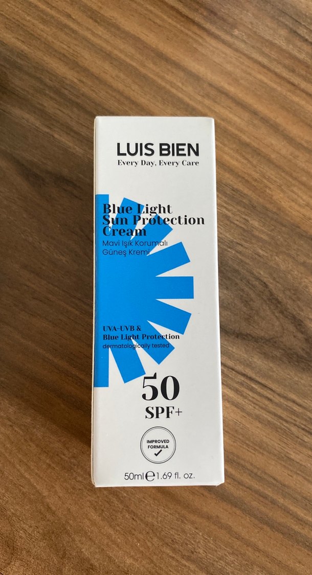 LUIS BIEN Mavi Işık Koruyucu Güneş Kremi, SPF 50 ile UVA-UVB ve mavi ışık koruması sağlar. Dermatolojik olarak test edilmiştir, 50 ml şişede sunulur. ☀️