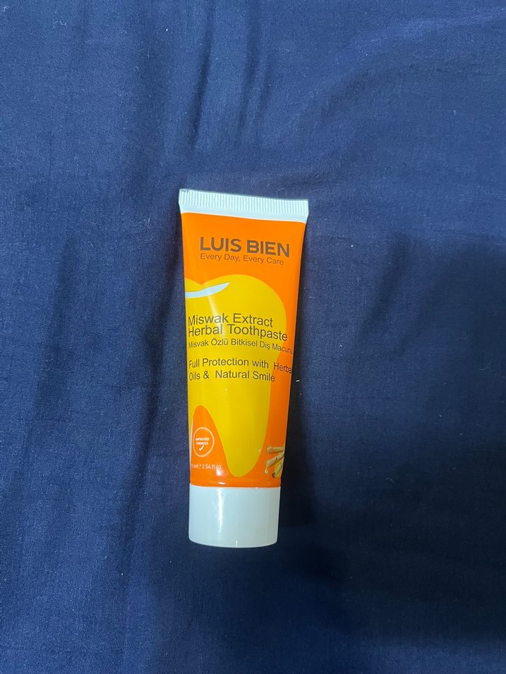 Luis Bien miswak özlü bitkisel diş macunu, doğal yağlarla tam koruma sağlar ve sağlıklı bir gülümseme sunar. Renkli sarı tüpte.