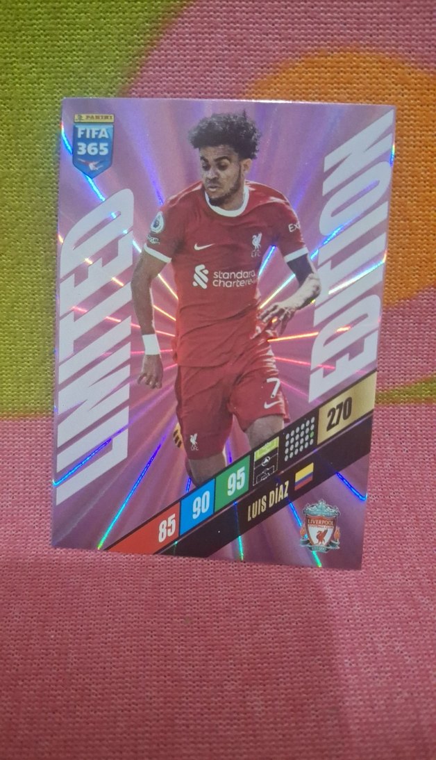 Luis Diaz futbol rozeti, FIFA 365 koleksiyonundan canlı kırmızı renkler ve dinamik tasarım içerir. İstatistikler ve Liverpool logosu bulunur. ⚽