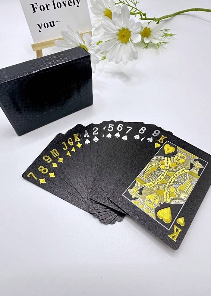 Lüks İskambil Kağıdı Siyah-altın rengi folyolu oyun kartları Kolay Temizlik için Suya Dayanıklı - Bu plastik poker oyun kartları suya dayanıklıdır ve dokusu pürüzsüzdür. İçecek dökülmeleri veya yiyecek lekeleri konusunda endişelenmenize gerek yok. Basit bir silme ile kolayca temizlenebilir. Esnek ve Rahat Kullanım - Kart destesi oldukça esnektir, 180° bükülebilir ve hemen eski haline döner. Çevre dostu, iyi baskı ve kaplama yapılmış olup bu kartların size mükemmel bir şekilde hizmet etmesini sağlar. Kenarları pürüzsüzdür, kolayca parçalanmaz ve plastik oyun kartlarını kolayca karıştırabilirsiniz. Paket İçeriği - Poker destesi 54 karttan oluşmaktadır; 52 siyah oyun kartı ve 2 Joker kartı