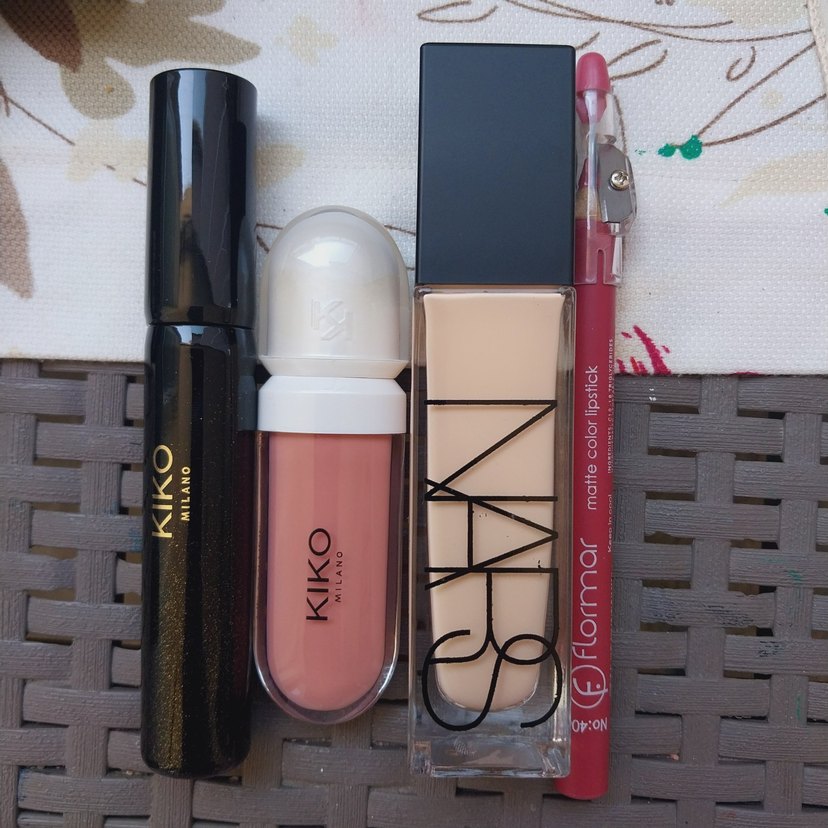 Kiko Milano'dan açık pembe mat bitişli ruj ve uyumlu dudak kalemi içerir. NARS'tan doğal tonlarda fondöten ile tamamlanmıştır.