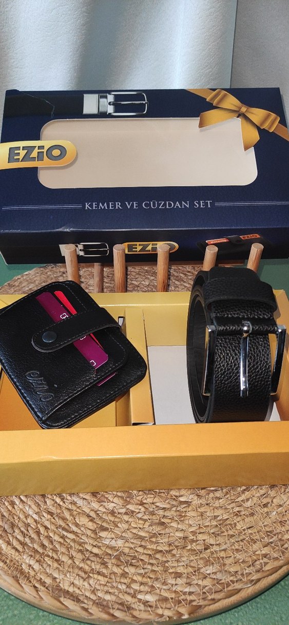 EZİO Marka Lüks Siyah Erkek Kemer - Cüzdan Hediye Seti – Kutulu / Sıfır Ürün ✨Şıklığı, işlevselliği ve kaliteli görünümü bir arada sunan bu EZİO hediye seti; Babalar Günü, doğum günü, yılbaşı ve tüm özel günlerde gönül rahatlığıyla hediye edebileceğiniz premium bir seçenektir. Ürün tamamen sıfır, orijinal kutusu ile gönderilir. Cüzdan Özellikleri Tasarım: Modern, dikey katlanabilir kompakt form Kullanım: Cebe tam oturur, taşırken rahatsız etmez Yaklaşık Ölçüler:Genişlik: 11.5 cm Yükseklik: 8.5 m ✨Kemer Özellikleri:Renk: Siyah Malzeme: Deri görünümlü (sunideri) Uzunluk: 114 cm Toka: Şık, minimalist metal tokalı Cüzdanla bütünleşen takım görüntüsü sunar Durum: Ürün kullanılmamıştır, sıfırdır. Hediye Hazır: Kutulu gönderim sayesinde ekstra paketlemeye gerek kalmadan direkt hediye verilebilir. Kullanım Alanı: Günlük, iş ortamı ve özel davetlerde ideal bir tamamlayıcıdır.