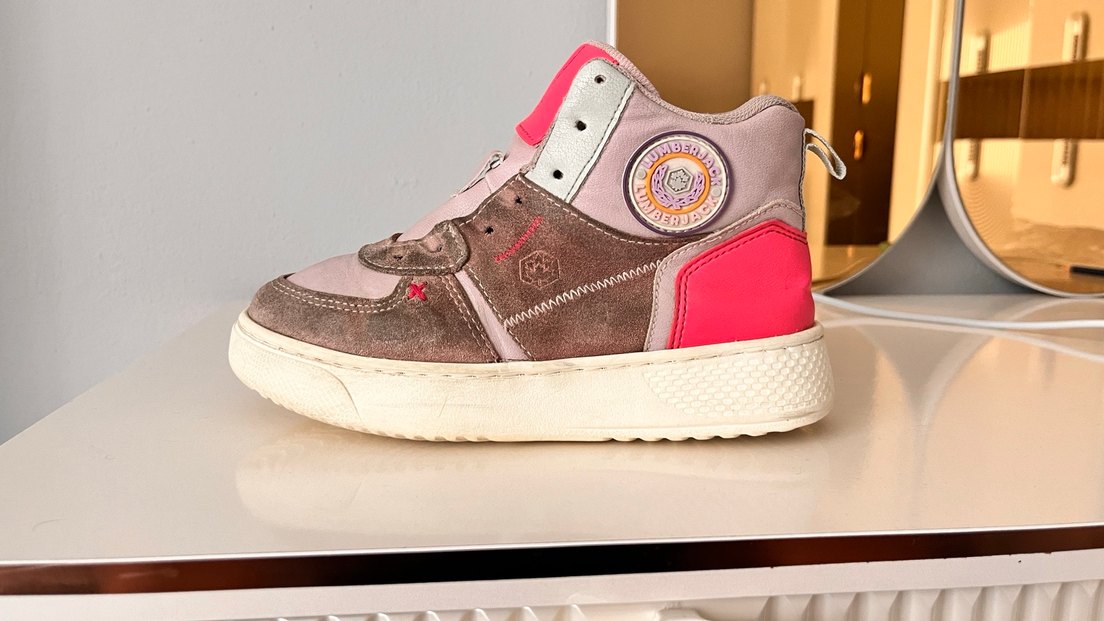 Pembe nubuk malzemeden yapılmış, gri baskılı detaylara sahip bağcıklı kız çocuk spor ayakkabısı, trend ve karşı kültür tarzını yansıtıyor.