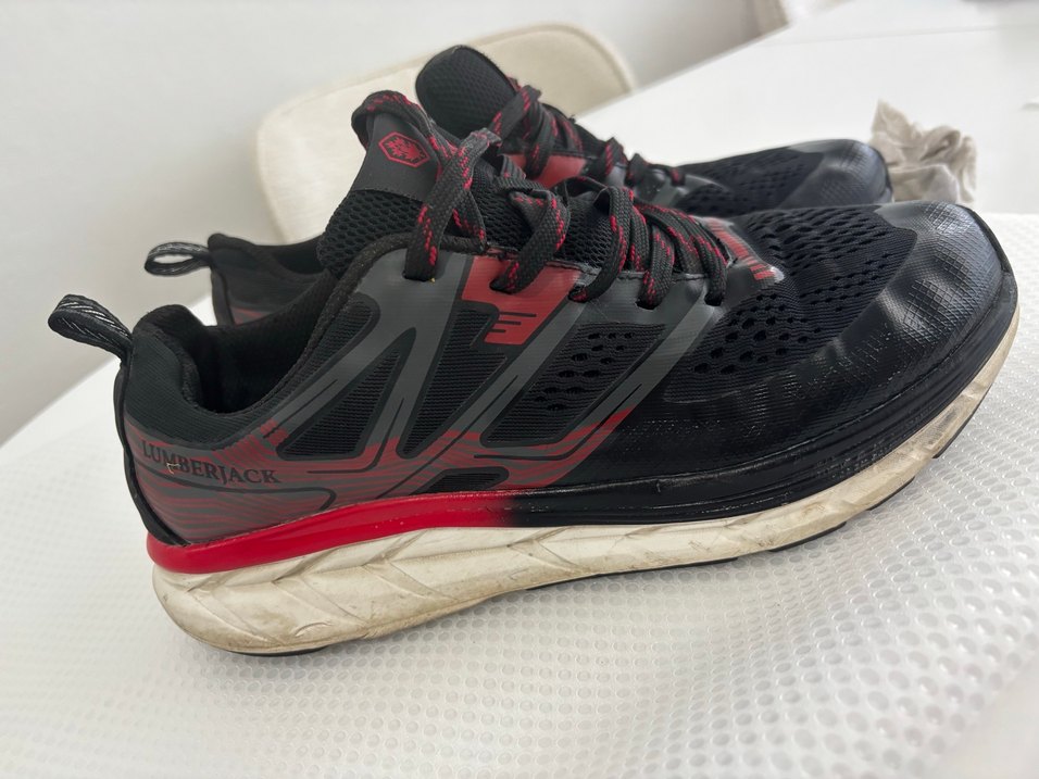 Kırmızı siyah renkli, desenli, bağcıklı erkek spor ayakkabısı. Kauçuk tabanlı, sokak stili ve athleisure için uygun. Orijinal az giyildi