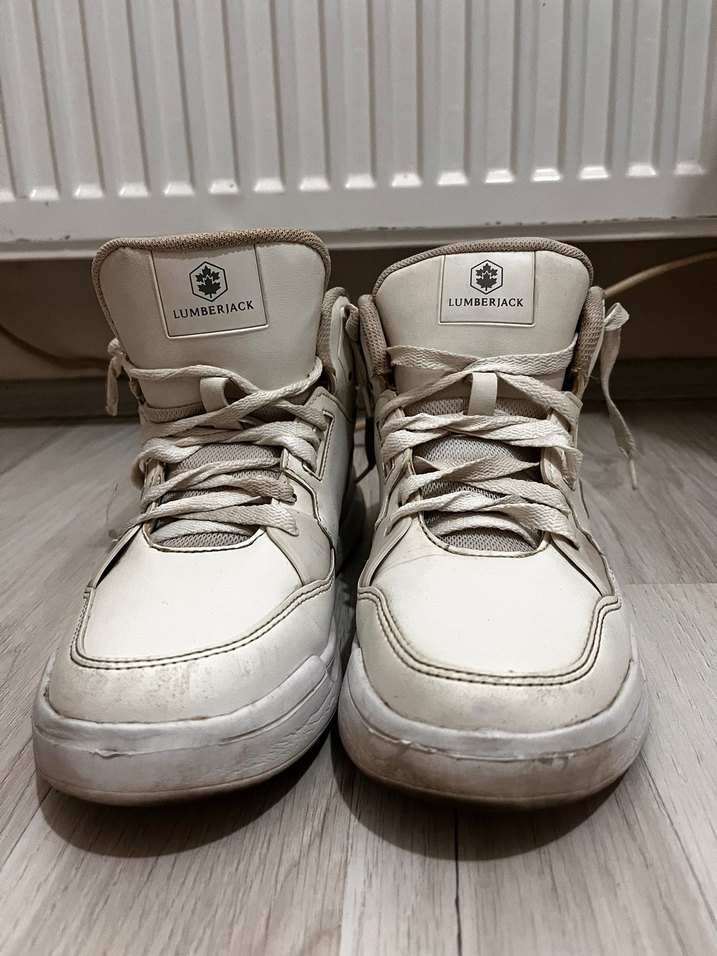 Lumberjack markalı beyaz ve gri renklerde, rahat kauçuk tabanlı kadın spor ayakkabısı. Sokak stili için şık ve rahat bir seçim